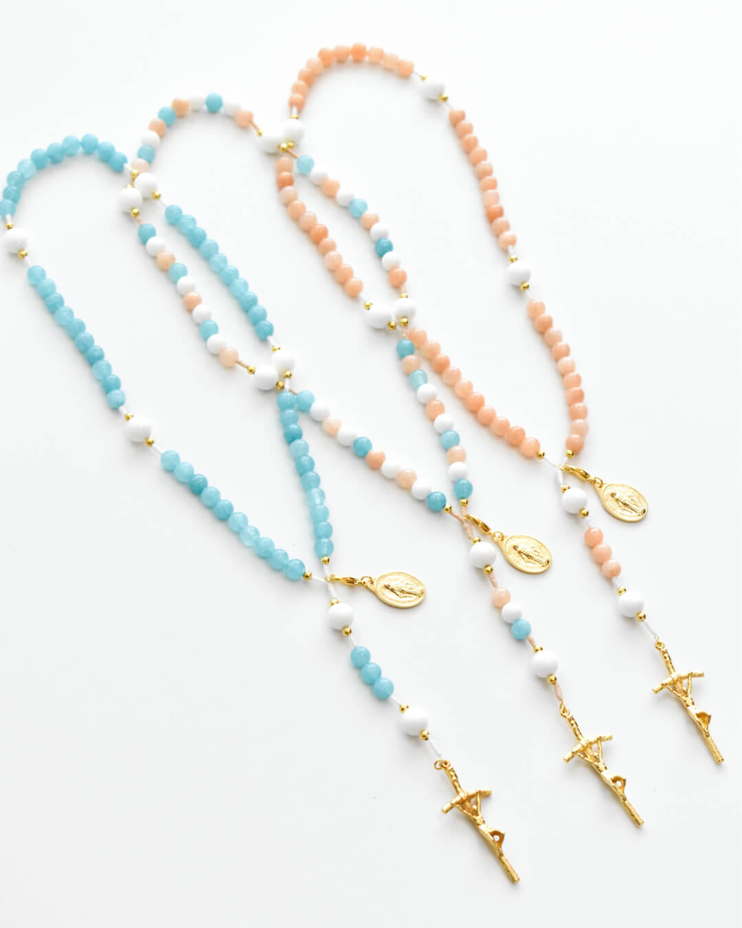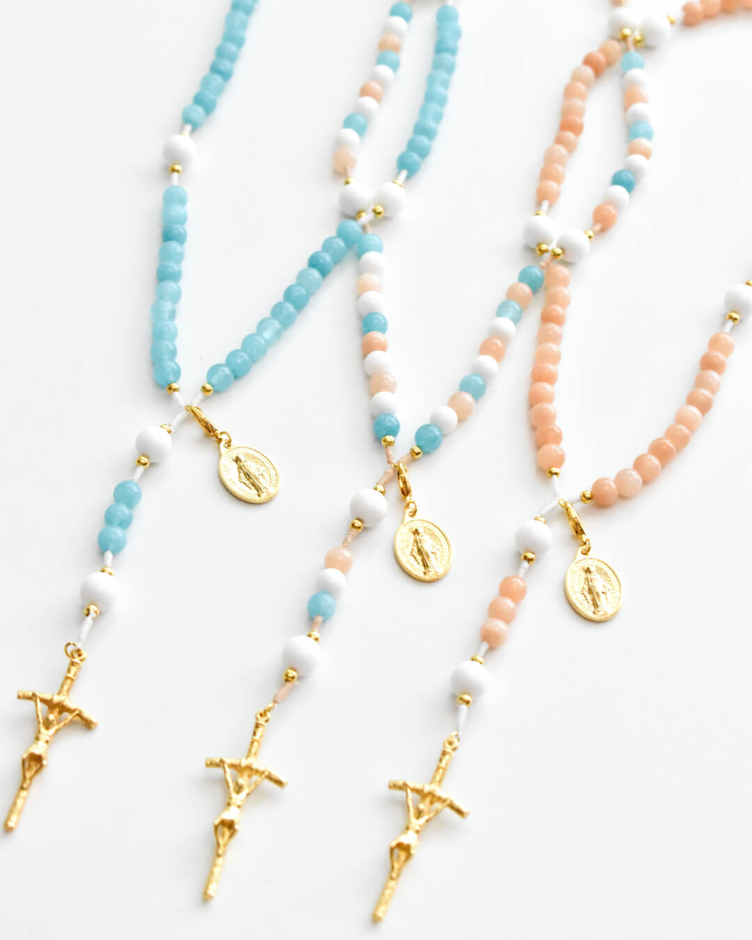 Full Rosaries and Stretch & Wrap Rosary Bracelets come with a Maria and I Prayer Card containing all the mysteries of the Rosary + Pendant Instructions.